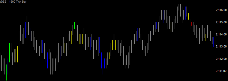 Note that in order to effectively calculate the ATV, the chart needs to be configured as a Ticks chart. The examples covered in this document correspond to a 1,500 ticks chart for the mini ES futures contract (@ES).