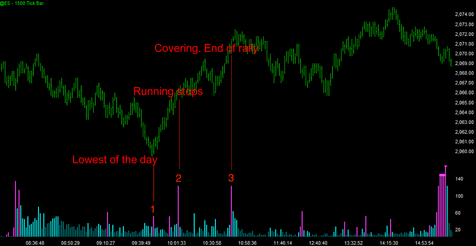 The bar marked as number 1 helps us to spot a high speed bar that will become the lowest low of the day. Bar marked as number 2 corresponds to all the stops that are being executed. Those stops belong to the traders with short positions betting on a lower market. Finally, bar marked as number 3 identifies the end of the bull rally.