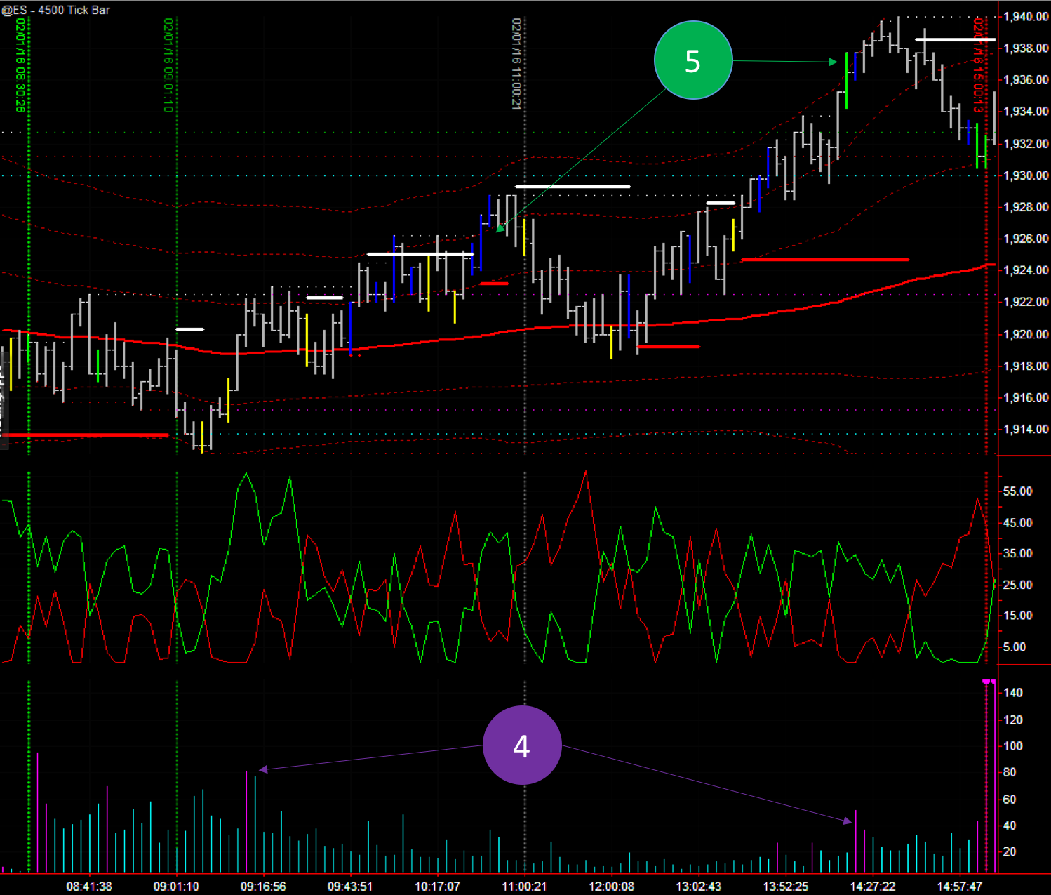 4) XBP Tape Speed: The first high speed signal came right on the bar that crosses above VWAP and start the rally for the day. Later, on the second highlighted bars, high tape speed marks the end of the rally together with a extreme high volume green bar in XBP Market Players.