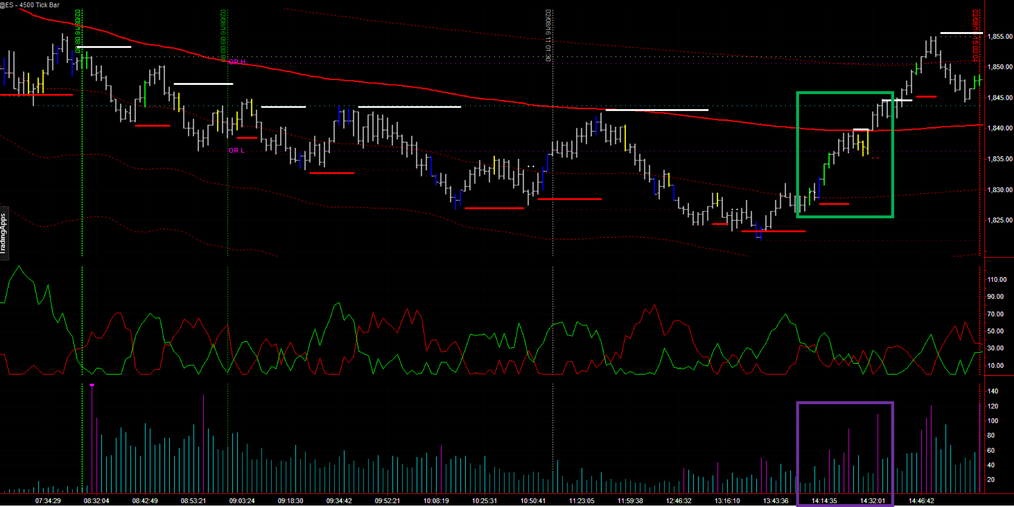 From 14:06 to 14:16 a set of green and blue bars appear, coupled with high tape speed bars and a support in BB SR Levels. The action happens at 1830 level which was the support level that hold the market during the day. We can interpret that the big market players entered the market here in a long direction sending the market higher and breaking the resistance of the day at 1845 level which hit the stops of many traders as seen in the high speed tape bar but lack of blue or green volume bars. I expect this level, 1830 to remain as a strong support/resistance level for the rest of the week.