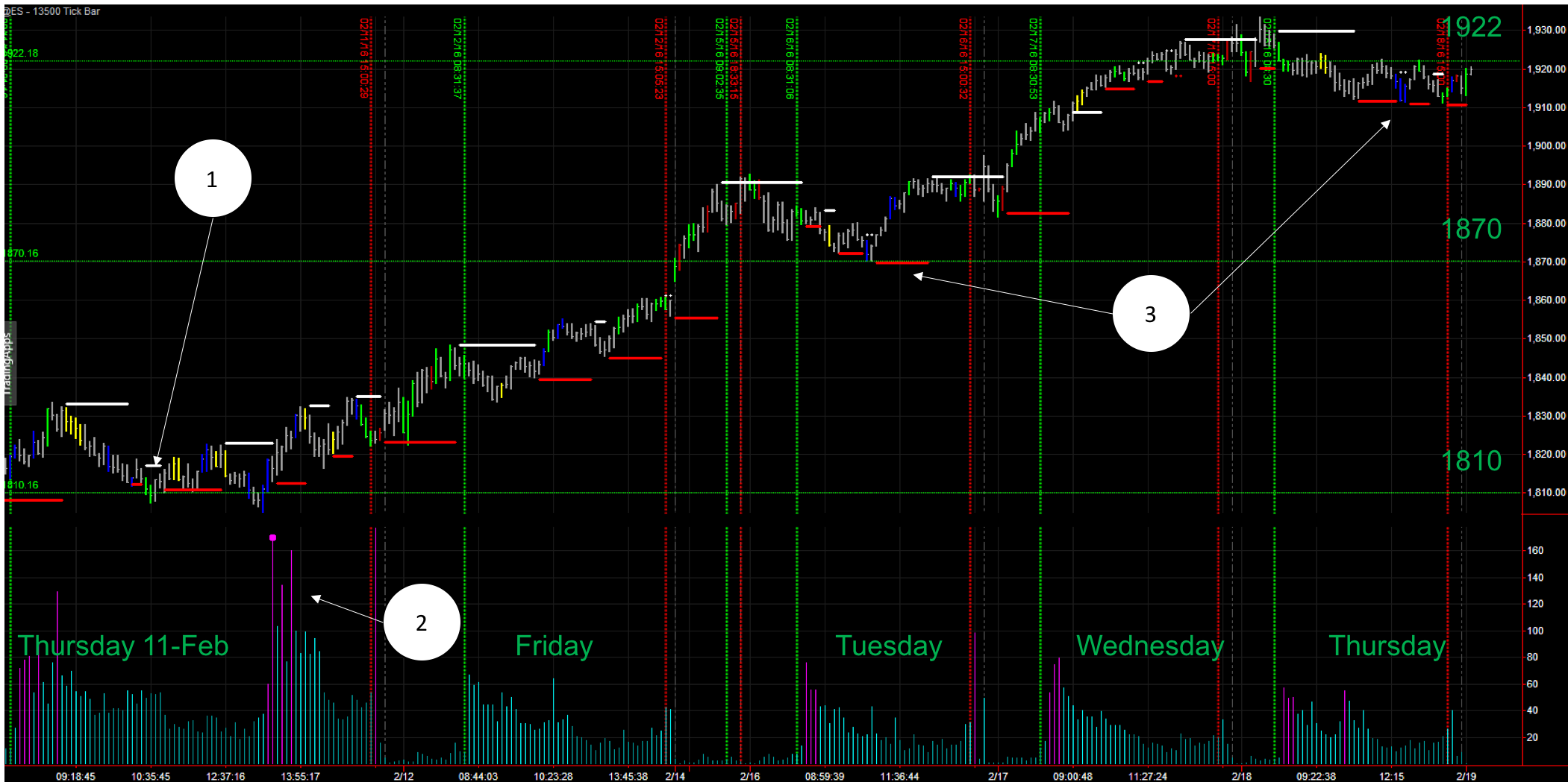 If you read the last weekly review post, we highlighted the volume and tape action that happened the last Thursday the 11th of February. (1) Green bars entered the market right at he bottom at 1810 level and shortly after high tape speed bars (2) were seen when this very same level of 1810 was tested. Since then the market has rallied up, crossing previous key support and resistance levels, like 1870. But is it the end of the rally or will it continue?