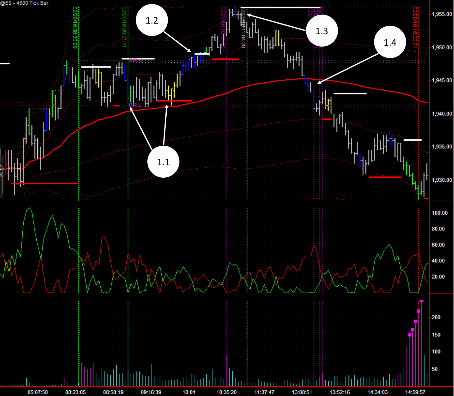 (1.4) This moment, the break below the VWAP is a trade that is based more on experience that anything else. It’s easy to see that the retail traders that now flipped to the long side, placed their stops behind the “”safety””of the VWAP level. Easy money again! Big volume blue bars are seen breaking below that VWAP and pushing the market all the below 1940 and reaching 1930, which was the bottom of the Intraday session as well.