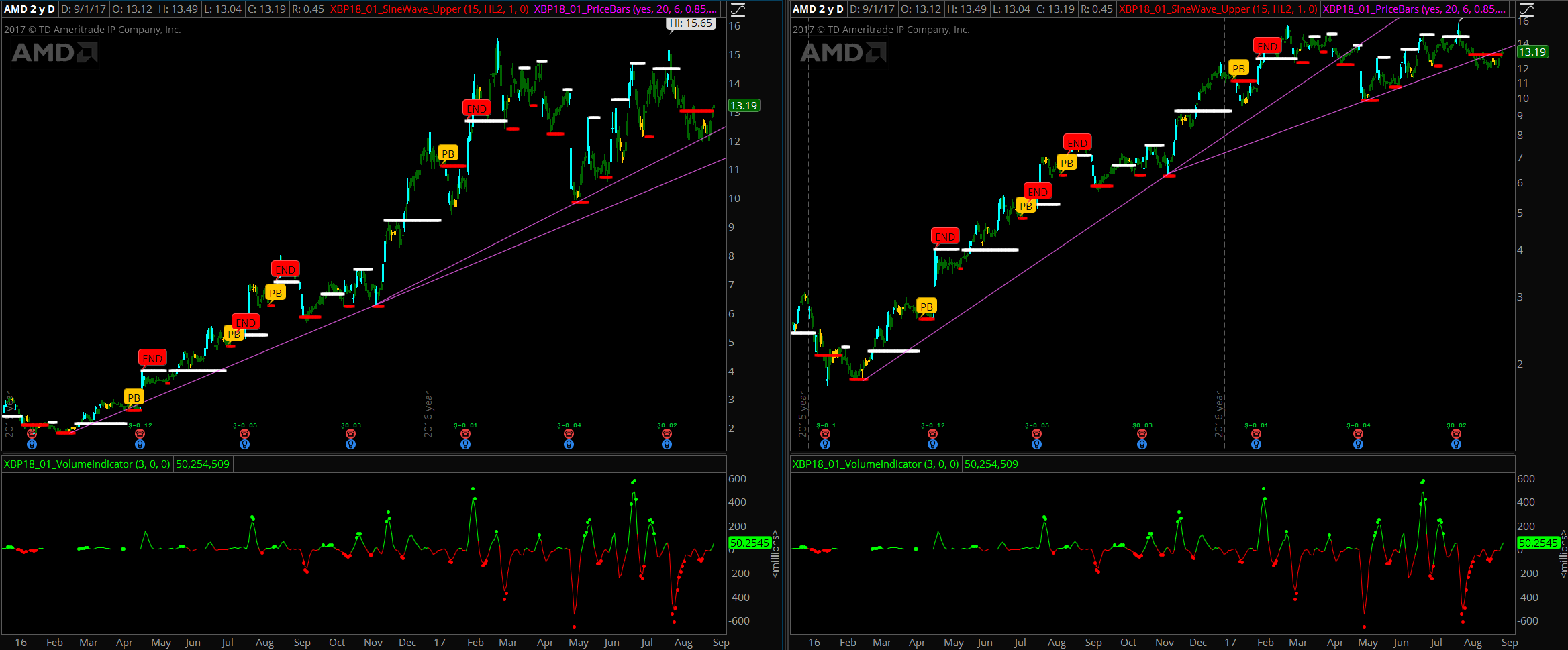 Both charts represent the last 2 years daily candlestick chart for AMD. The indicators included are the XBP Sine Wave, XBP Price Bars and the lower indicator is the XBP Volume Indicator. The trend support lines are drawn in any of the charts and they sync across (you can enable this feature in ThinkOrSwim). To easily identify the trend lines let’s call Trend Line 1 the on that connects the lows of February and November 2016 and Trend Line 2 the one that connects the lows of November 2016 and May 2017.