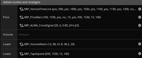 In tick chart, the “Price Bars” indicator. This indicator paints the price bars to identify in which bars there has been a relatively high (blue) or low volume (yellow). I have the low volume indicator disabled as I’ve found that it is of no use to me. You can check to see if you can spot something that I don’t.