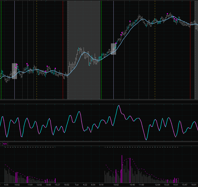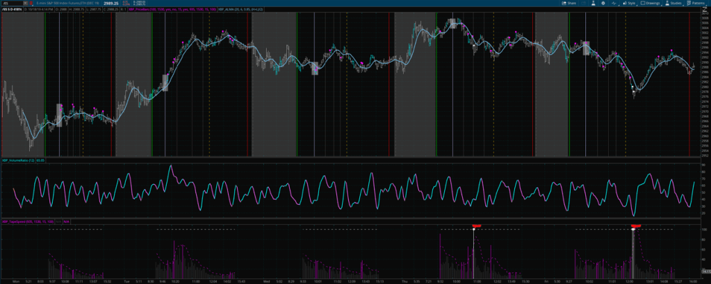 Friday, which always is a tricky day, follows the Reaction box breaking rule, only this time price continues falling for 20 minutes past noon. Extreme tape speed bars give us a hint that plenty of action/volume occurred and those two bars at the very bottom.