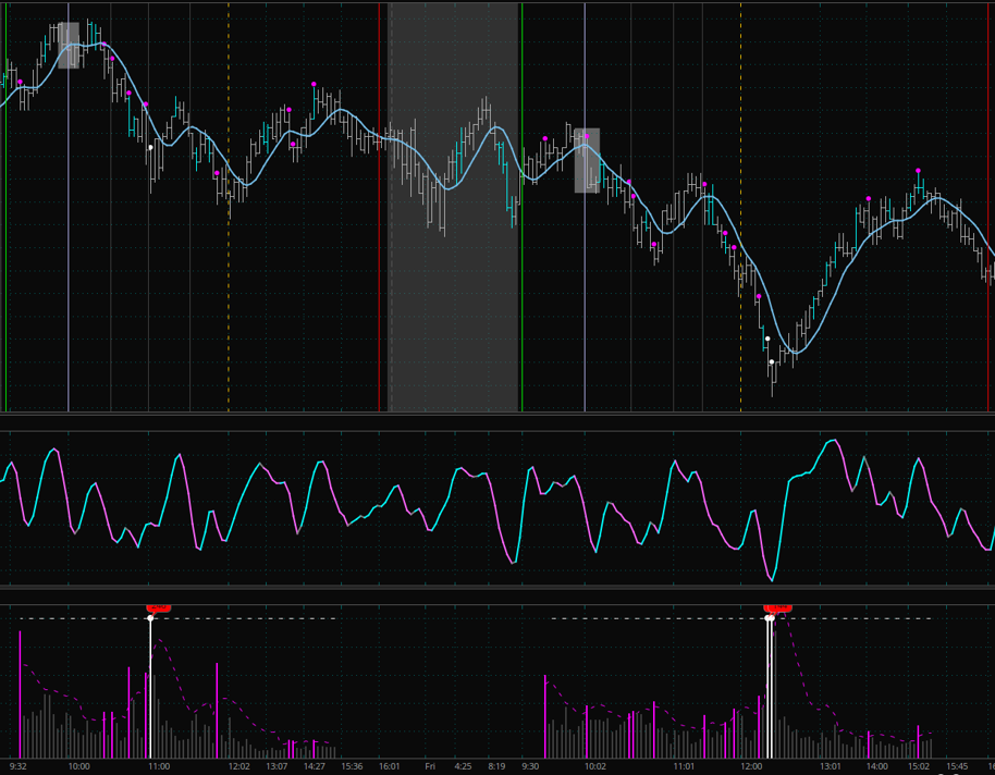 Friday, which always is a tricky day, follows the Reaction box breaking rule, only this time price continues falling for 20 minutes past noon. Extreme tape speed bars give us a hint that plenty of action/volume occurred and those two bars at the very bottom.