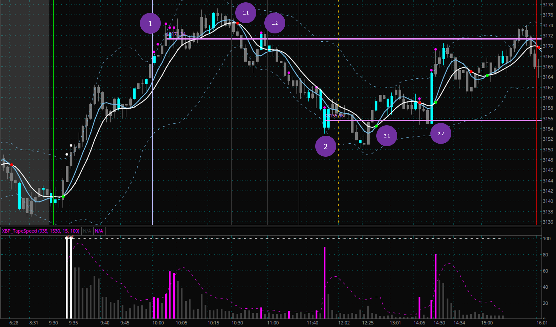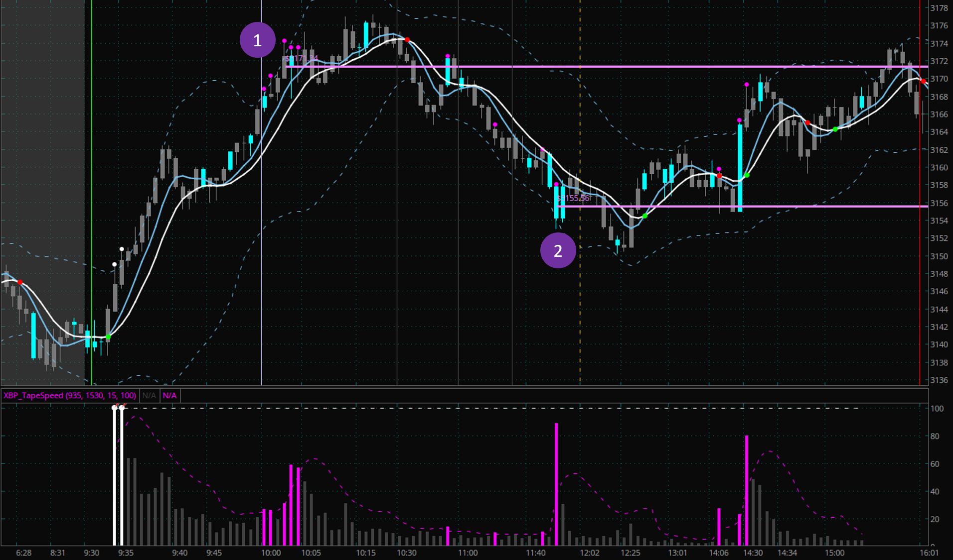 When the market prints significant higher tape speed readings (purple bar chart) together with big volume (blue price bars) we can draw price level support/resistance lines. In this case we did this for moments 1 and 2. You can then see how these levels act as important support/resistance levels in the future.