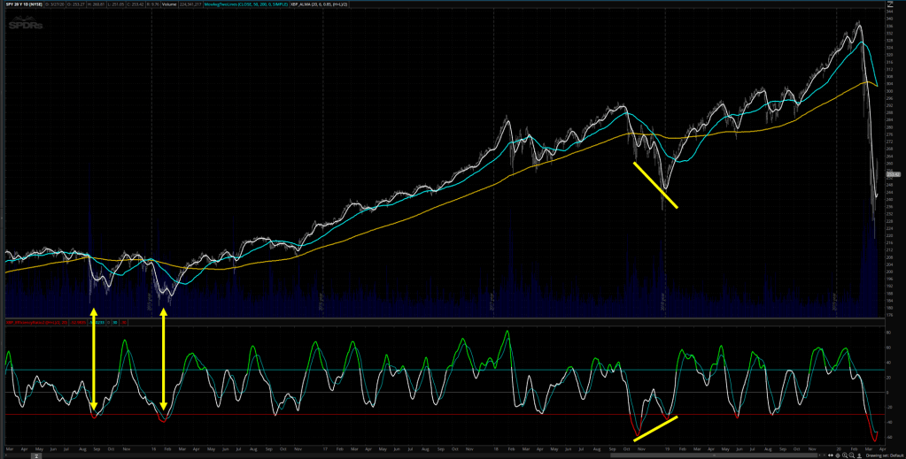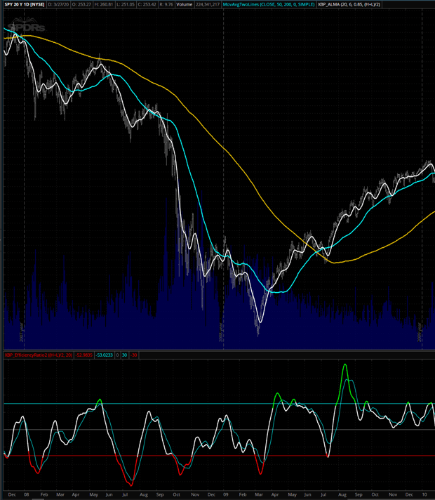 On the first screenshot you have the SPY from March 2015 until today March 29th 2020. In the price graph there are 3 indicators. The white line is the ALMA moving average for the price, so we can compare averages instead of single price bars. The blue line is the 50 SMA and the orange line is the 200 SMA. On the lower graph is the XBP Efficient Ratio indicator, which is an oscillator that indicates overbought / oversold areas and can detect tops and bottoms with bullish and bearish divergences with price.