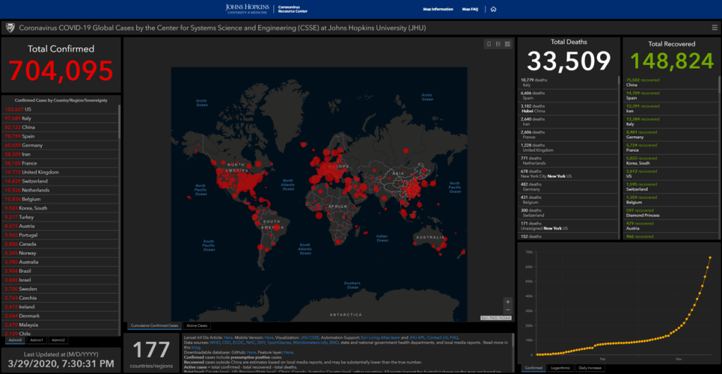 COVID-19 all around the world with almost literally no country free of its impact. As of today, Sunday 29th of March 2020 the total confirmed cases (well below the estimated real cases) is of 700k people, of which around 34k have reportedly died of the virus.