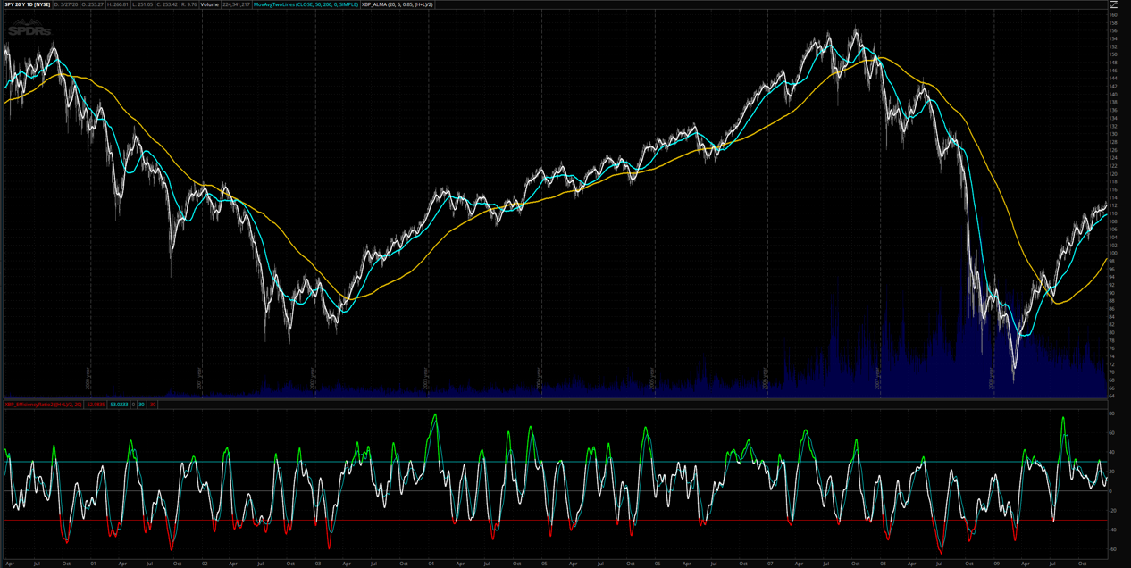 On the first screenshot you have the SPY from March 2015 until today March 29th 2020. In the price graph there are 3 indicators. The white line is the ALMA moving average for the price, so we can compare averages instead of single price bars. The blue line is the 50 SMA and the orange line is the 200 SMA. On the lower graph is the XBP Efficient Ratio indicator, which is an oscillator that indicates overbought / oversold areas and can detect tops and bottoms with bullish and bearish divergences with price.