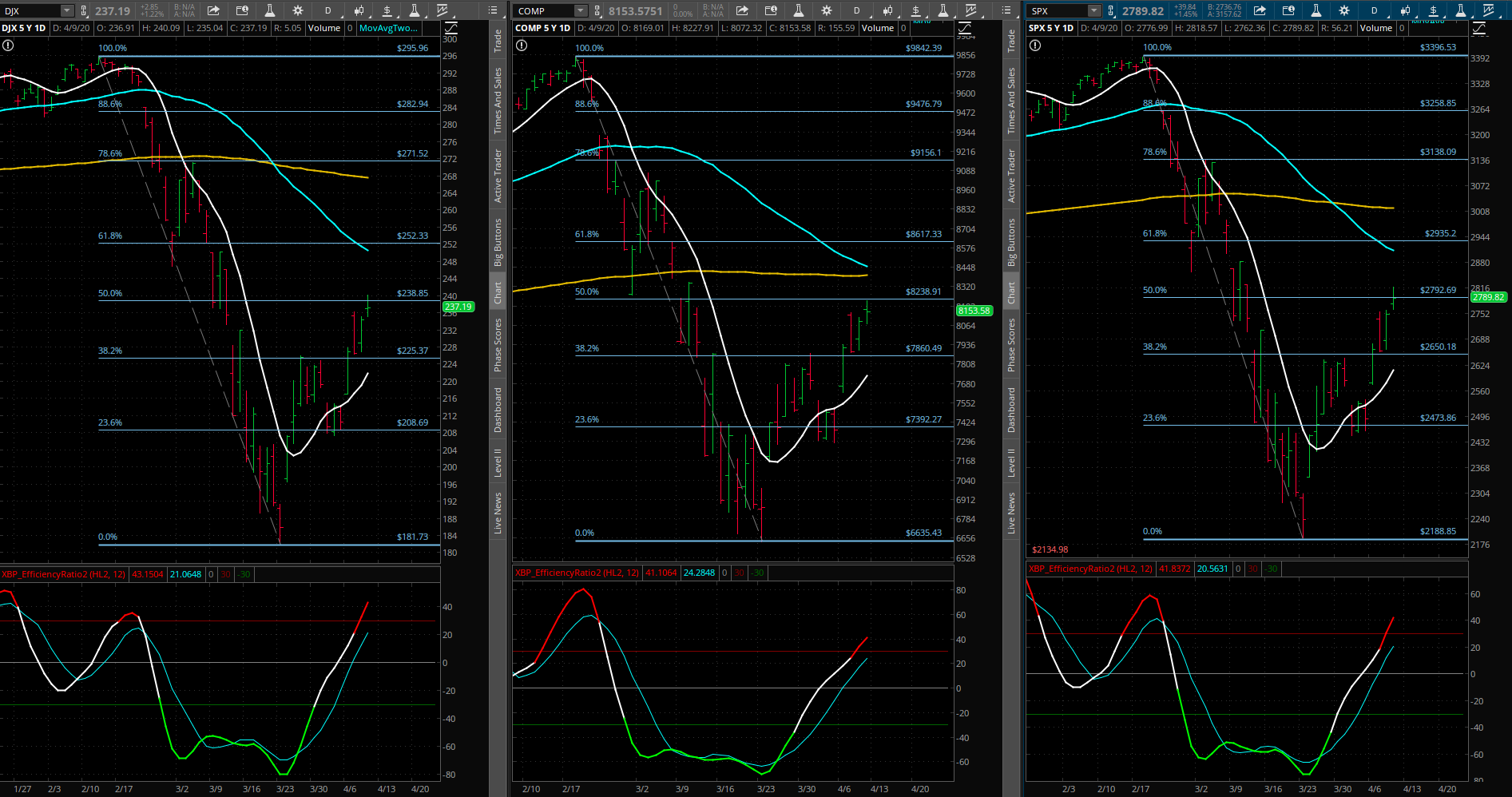 All 3 indices closed below the 50% retracement level. Also, the 3 of them are in overbought territory for the Efficiency Ratio indicator.