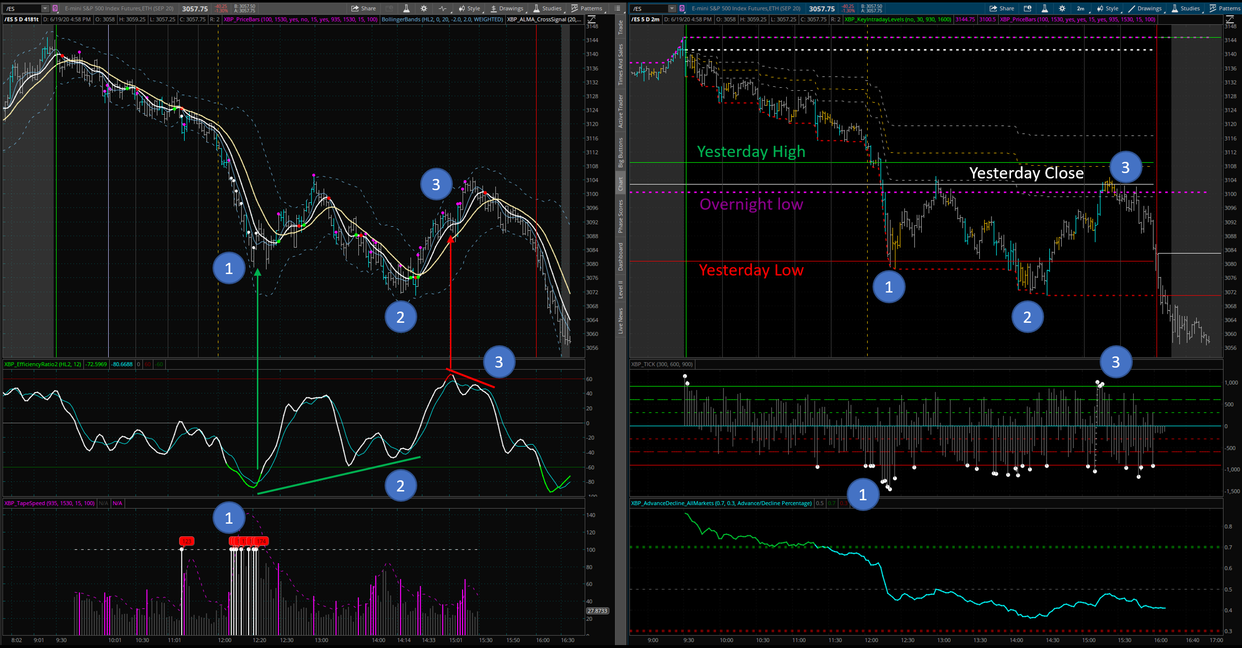 (1) At noon time, when price reaches Yesterday’s High level breaks the support level with a lot of energy and breaks as well below the Overnight Low level aiming towards the next resistance at Yesterday’s Low level. We can see bars of high volume and high speed in the ticks chart where the XBP Efficiency Ratio indicator (normally a leading indicator) is already showing oversold readings. Once price reaches the Yesterday’s Low price level we can extreme $TICK reads in the time chart. Also, yellow price bars appear signaling a drop in volume. A pause or a reversal is coming and it is a good point to get out of any short position.